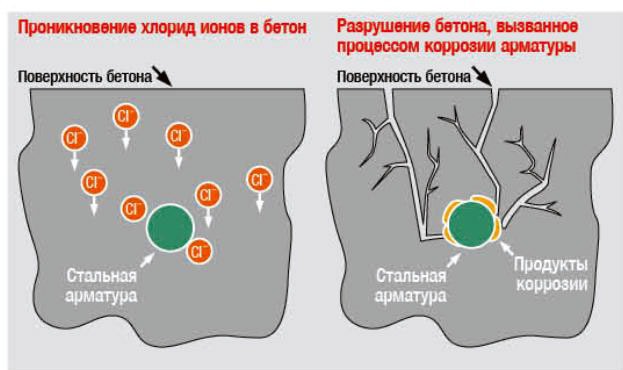 • Хлориды ускоряют коррозию, разрушая защитный слой на стали.